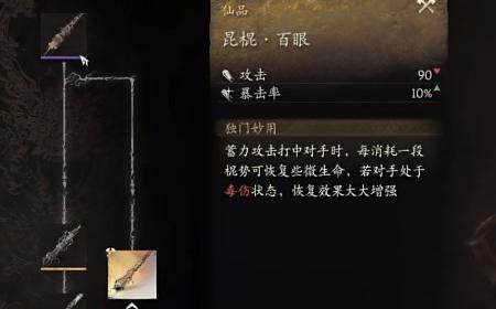 昆棍百眼的独门妙用是蓄力攻击打中对手时,每消耗一段棍势可恢复些微生命,若对手处于毒伤状态,恢复效果大大增强...