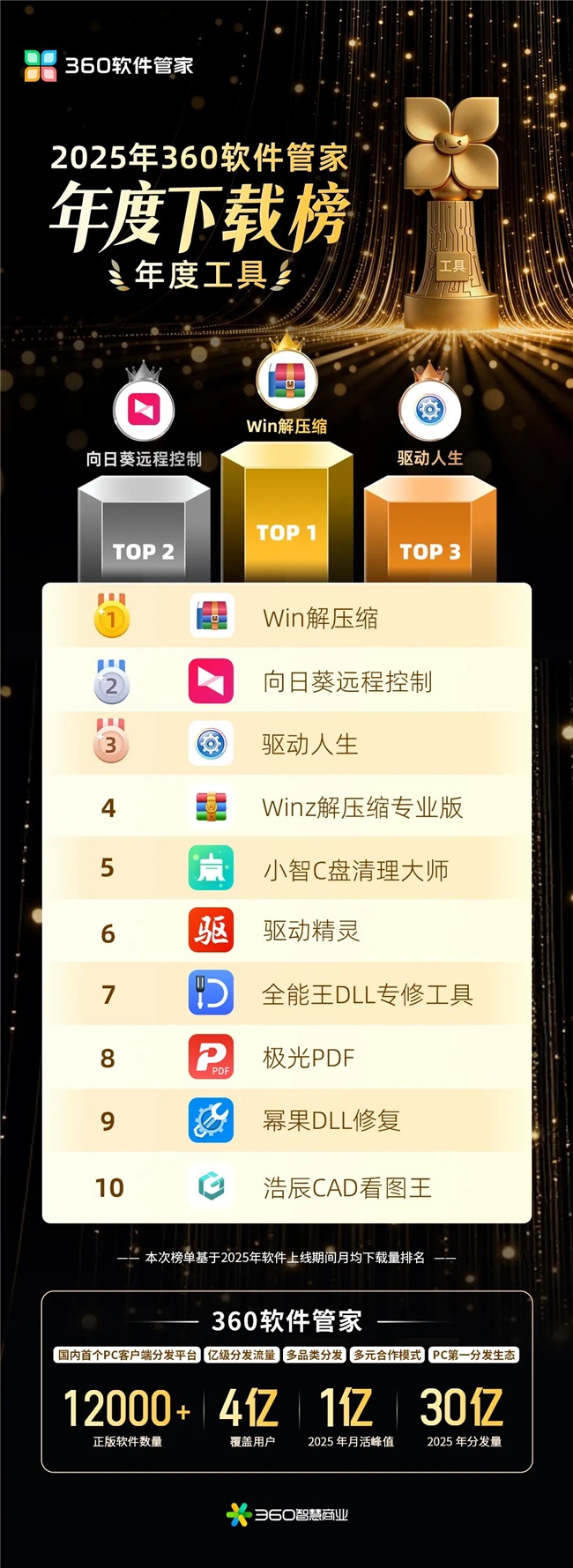 “年度工具榜”中,Win解压缩、向日葵远程控制、驱动人生等工具依托在文件处理、远程协作等办公细分场景中的实用性稳居前列,成为用户高频依赖的效率工具;
