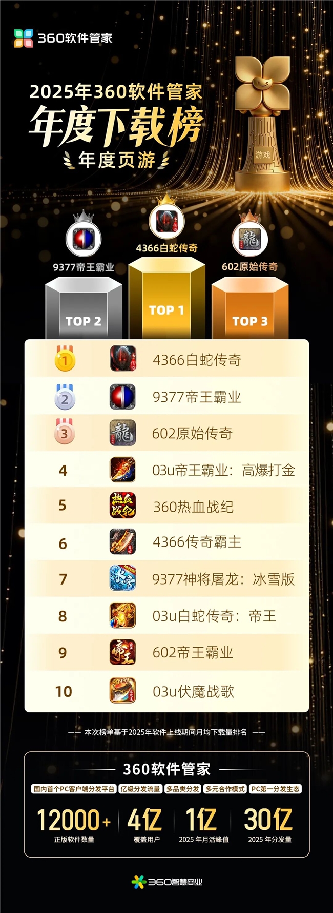 “年度页游榜”聚焦轻量化娱乐需求,4366白蛇传奇、9377帝王霸业、602原始传奇等依托H5技术适配与社交玩法创新,人气持续高涨,展现细分赛道的差异化竞争力;