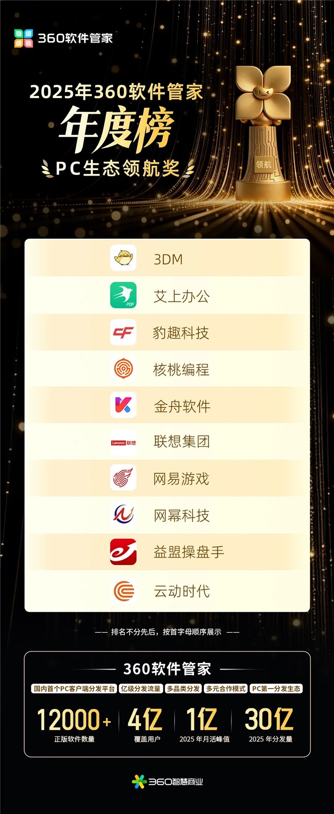 与此同时,平台特别增设“年度生态领航奖”,向长期以来与360软件管家携手共建PC生态的合作伙伴致敬。