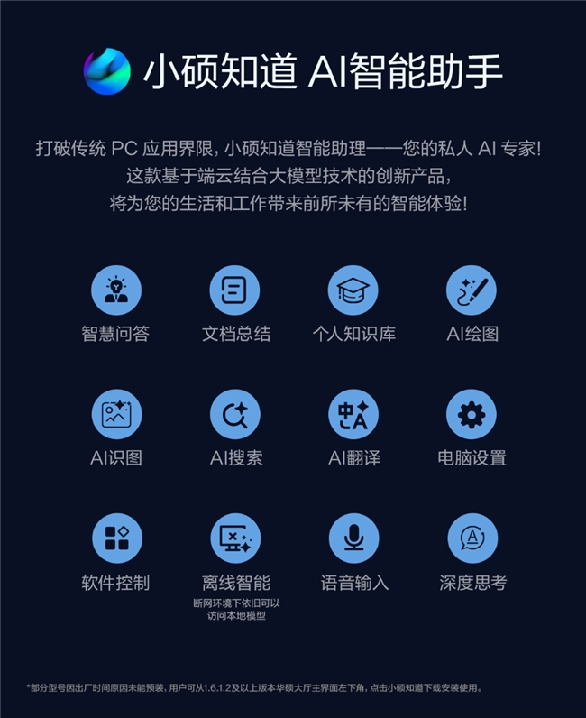 标配32GB LPDDR5X超高频内存以及1TB PCle 4.0高速SSD;拥有全能接口,包括2个USB-A 3.2、全功能雷电4接口、全功能USB-C 3.2、HDMI 2.1 TMDS以及3.5mm音频接口;内置断网可用的“小硕知道”AI智能助手,带来智慧问答、文档总结、AI绘图、AI识图、AI搜索、AI翻译、电脑设置、软件控制等功能,全场景高能高效,智能协助大幅提升办公学习效率。