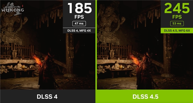 DLSS 4.5技术采用全新6倍多帧生成模式,实现了流畅度的巨大飞跃!凭借第二代 Transformer 模型的出色图像稳定性,结合帧率控制与画质的优化,DLSS 4.5技术可为每个渲染帧额外生成多达5帧,实现最高6倍的帧率提升!