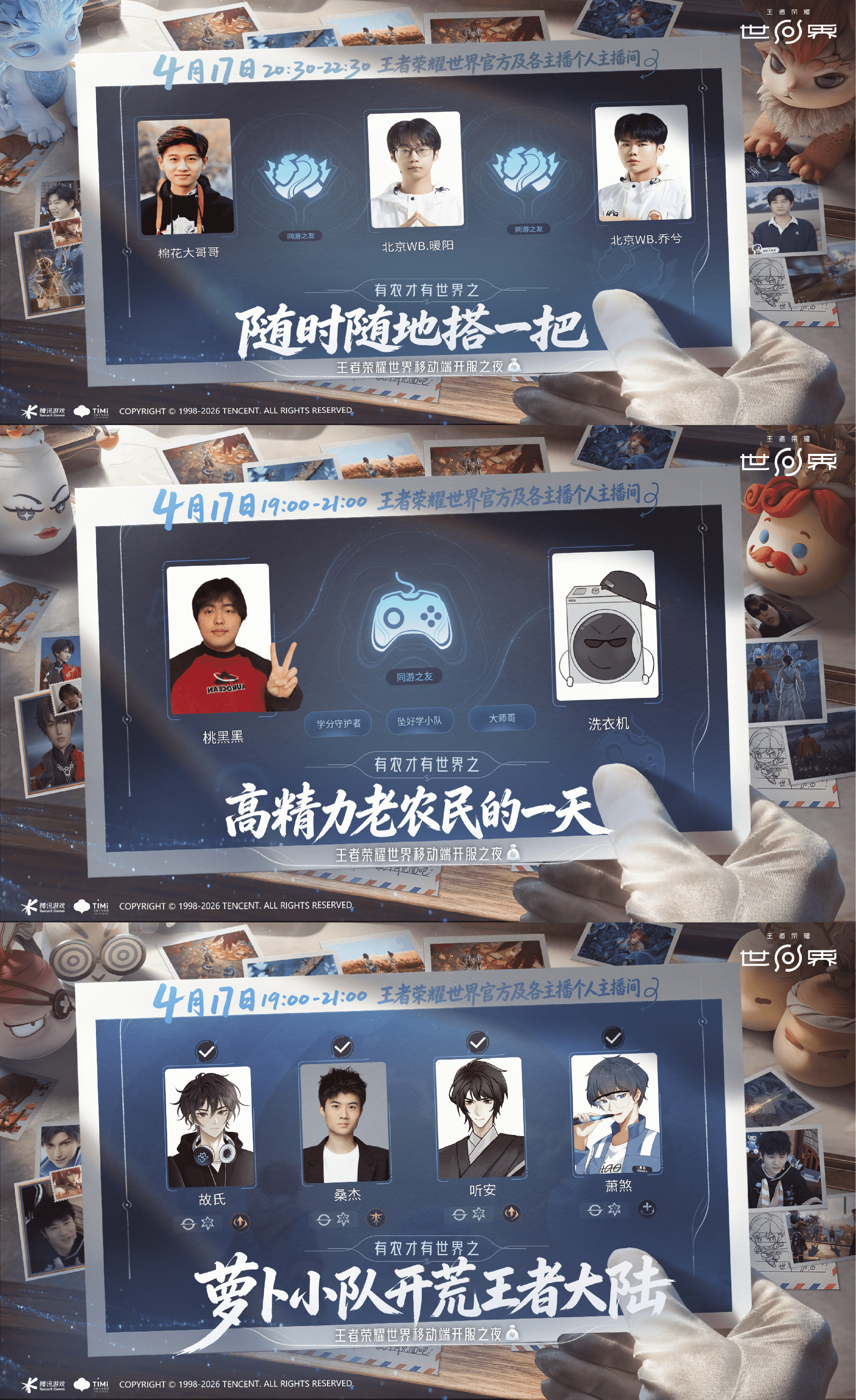 在游戏外,《王者荣耀世界》将进行开服之夜特别直播,由棉花大哥哥、暖阳和乔兮为大家展示在线匹配水友花式摇人大PK,桃黑黑、洗衣机表演高精力“农民”在稷下自律学习的一天,故氏、桑杰、听安、萧煞的四人萝卜小队将在线开荒王者新大陆。众多嘉宾汇聚“世界”,与各位玩家一起共庆移动端上线。