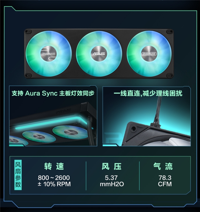 风扇设计直接影响散热效率与使用体验。PRIME LC II 360 ARGB LCD标准版水冷搭载一体式高性能ARGB风扇,支持PWM智能调速,转速范围为800~2600±10% RPM。其最大风压达5.37mmH2O,气流高达78.3CFM,可快速带走冷排热量。同时,风扇运行噪音仅约35.6dB(A),即使在夜间使用也不会干扰玩家。此外,风扇采用一线直连设计,供电与灯效信号通过单根线材传输,大幅降低机箱内部理线难度。不仅提升了装机整洁度,更契合当下玩家对简约桌面的追求。针对DIY玩家痛点,该水冷在安装环节进行了多项优化。冷头表面预涂高性能硅脂,玩家无需额外购买与涂抹,直接安装即可获得最佳导热效果,大幅降低新手操作难度。该水冷兼容性覆盖当前主流平台,实力非凡。