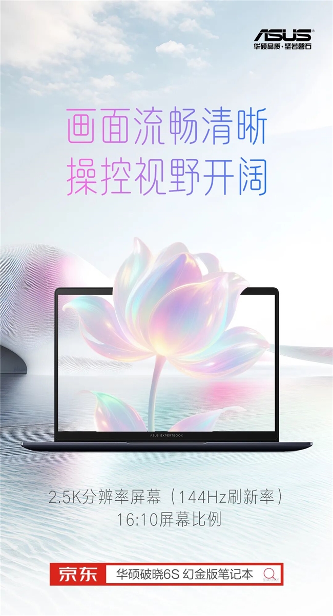 视觉体验直接影响工作效率与心情。华硕破晓6S幻金版配备了一块2.5K高分辨率屏幕,画面细节分毫毕现。144Hz的高刷新率则让每一次页面滚动、光标移动都丝滑流畅。16:10的屏幕比例进一步增大了显示面积,在查阅文档、编辑表格时能一屏显示更多内容,提升信息获取效率。