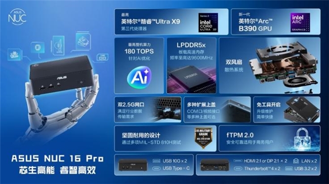 华硕NUC系列迎来重要迭代。全新的NUC 16 Pro于CES 2026亮相,它是首批搭载Intel新一代Core Ultra 300H系列处理器(Panther Lake架构)的机型之一,在性能与能效比上实现跨越式升级。NUC 16 Pro至高搭载酷睿Ultra X9核心,搭配12Xe Arc核显,同时新设计的板载内存速度高达9600MHz,无论是运行小型AI模型、生成AIGC内容、亦或者是高算力要求的办公任务,都能轻松应对。