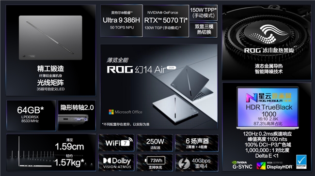 具备大屏专业创作属性的ROG幻16 Air 2026同样迎来全面升级。其搭载酷睿Ultra 9 386H处理器与至高RTX 5090 笔记本电脑GPU,并采用全新升级的冰川散热架构,使整机核心功耗释放提升到至高175W,性能更为强悍。同时机身依旧保持了约1.95kg重、1.49cm薄的出色便携性。屏幕上,其16英寸ROG星云原画屏具备2.5K分辨率、240Hz刷新率、0.2ms疾速响应等顶级参数,峰值亮度达1100nits,通过了VESA DisplayHDR True Black 1000认证,出厂校色支持色域切换,为专业工作流提供了更沉浸、更流畅、更高素质的视觉体验。