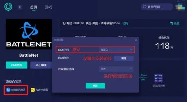 加速后点击左下角的“切换战网地区”,选择想要前往的区服后点击确定,这个时候你的战网客户端就切换成国际服了。